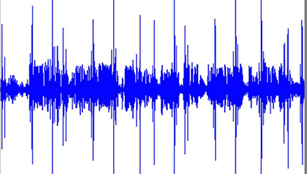 在圖中可以看到很多持續時間非常短但強度很大的短促聲音,這就是瞬間噪音。瞬間噪音往往具有很強的刺激性,容易驚嚇助聽器佩戴者,使其無法集中注意力,并且感覺很難受。