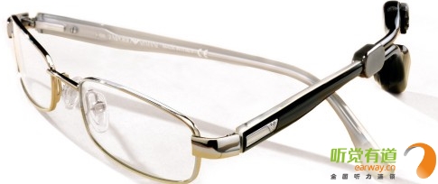 眼鏡式骨導助聽器是將麥克風、放大器、電池倉、音量控制旋鈕和振動器安裝在眼鏡腿內,通過振動的方式將聲音傳送至耳蝸,此類助聽器能滿足聽覺障礙與近視雙重缺陷人士的需要,但在國內這款已被市場淘汰。