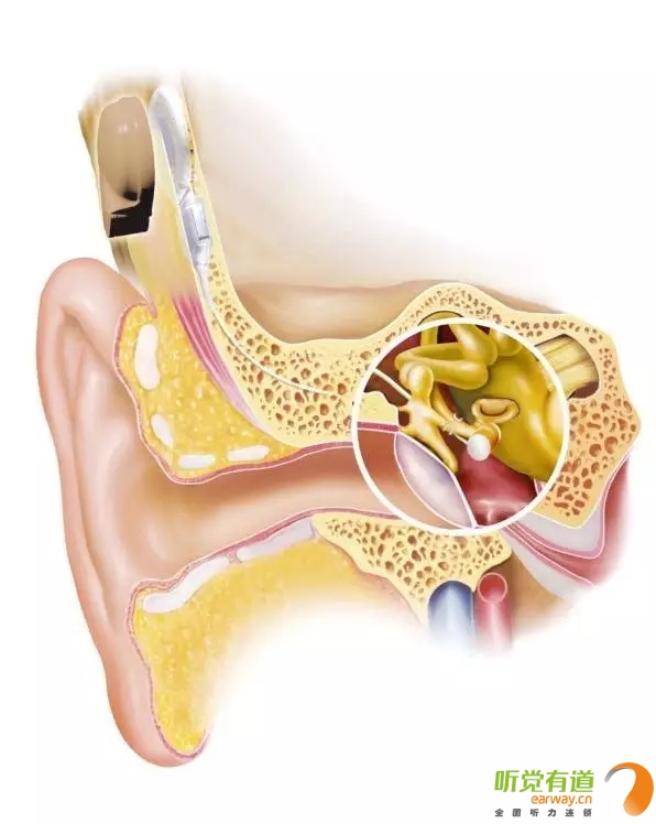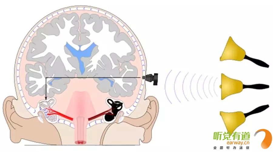 聲音傳入人耳有兩個途徑,一個是空氣傳播,”耳廓——外耳道——鼓膜——中耳——內耳“;另一個是骨頭傳導,”顱骨——內耳“。不管哪種方式,最終都是為了聲音能傳到內耳。骨導助聽器的原理,就是將助聽器放大的聲音不再通過“空氣傳導”,而是借助人本身已有的“骨頭傳導”,將聲音傳至內耳。
