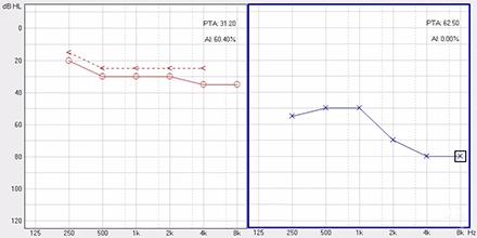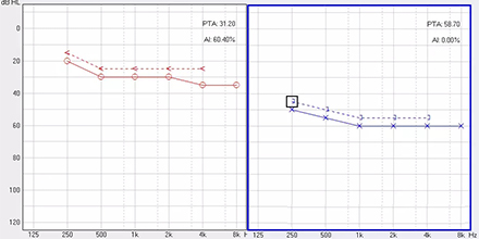 <span style="font-size:16px;"> 純音聽閾測試是聽力學(xué)所有測試項目中最基本的一項內(nèi)容,包括氣導(dǎo)(AC)、骨導(dǎo)(BC)、最舒適閾(MCL)與不舒適閾(UCL)測試。測試結(jié)果能夠直接反映患者雙耳的聽力損失程度、性質(zhì)與動態(tài)范圍,還能夠間接反映患者的患病位置、病因與助聽后效果。</span></p><p><span style="font-size:16px;"> 一般地,整個檢查控制在10分鐘左右,既能全面做完檢查,又不至患者疲憊而影響主觀反應(yīng)。</span></p><p><span style="font-size:16px;"> 純音聽閾測試是最考驗聽力學(xué)工作者實際工作能力的一項基本內(nèi)容:</span></p><p><span style="font-size:16px;"> 1、若患者曾長期暴露于噪聲中,且無其它致使聽損因素,很可能在3 kHz或6 kHz出現(xiàn)明顯的下降,聽力曲線呈現(xiàn)“V”字形,所以除了常規(guī)的倍頻程頻率外,還要加測這兩個頻率,否則就犧牲了多通道助聽器的意義;</span></p><p><span style="font-size:16px;"> 除了有過噪聲接觸史的患者需要加測半倍頻程外,涉及聲場助聽聽閾評估、賠償?shù)惹闆r都需要加測半倍頻程。</span></p><p><span style="font-size:16px;"> 耳鳴困擾的患者,注意避免與耳鳴聲類似的純音,若還用純音作為刺激聲,患者就會分辨不清,出現(xiàn)假陽性或假陰性。所以,測試者要換成囀音,既有別于耳鳴聲,又具有頻率特異性。</span></p><p><span style="font-size:16px;"> 2、不舒適閾反映患者對大聲的忍耐力,不舒適閾與氣導(dǎo)的差值能顯示患者的動態(tài)范圍,指導(dǎo)驗配師調(diào)節(jié)助聽器的最大輸出。</span></p><p><span style="font-size:16px;"> 不舒適閾測試頻率是否越多越好呢?非也。測得頻率過多,一會引起患者疲勞或不適,二是沒必要,大多數(shù)助聽器的最大輸出是一個整體,不能像調(diào)增益和壓縮那樣分通道,所以測多了并無好處,一般測0.5、1、2、4 kHz。</span></p><p><span style="font-size:16px;"> 3、如果兩側(cè)聽力有明顯差異,此時就要準(zhǔn)備好掩蔽了,分為氣導(dǎo)掩蔽與骨導(dǎo)掩蔽。</span></p><p><span style="font-size:16px;"> (1)氣導(dǎo)掩蔽的判斷有兩個原則,只要符合其中一個原則,就需要重新測差耳氣導(dǎo)。具體做法是:</span></p><p><span style="font-size:16px;"> 測試完雙耳氣導(dǎo),若發(fā)現(xiàn)某一頻率差耳氣導(dǎo)閾值比好耳氣導(dǎo)閾值多40 dB以上就要懷疑有可能是好耳偷聽的,需要給好耳氣導(dǎo)加掩蔽聲;</span></p><p><span style="font-size:16px;"> 測試完雙耳氣導(dǎo)與好耳骨導(dǎo),若發(fā)現(xiàn)某一頻率差耳氣導(dǎo)閾值比好耳骨導(dǎo)閾值多40 dB以上就要懷疑有可能是好耳偷聽的,需要給好耳氣導(dǎo)加掩蔽聲。</span></p><p><span style="font-size:16px;"> 下面為未掩蔽的聽力圖:</span></p><center><span style="font-size:16px;"><img alt="" src="/upfiles/201809180234471614.png" width="440" height="220" /></span></center><p></p><p><span style="font-size:16px;"> 下圖為掩蔽后的左耳真實氣導(dǎo)值:</span></p><center><span style="font-size:16px;"><img alt="" src="/upfiles/201809180234541797.png" width="440" height="220" /></span></center><p></p><p><span style="font-size:16px;"> (2)骨導(dǎo)掩蔽的判斷原則:</span></p><p><span style="font-size:16px;"> 測試完雙耳氣導(dǎo)與好耳骨導(dǎo),若發(fā)現(xiàn)某一頻率差耳氣導(dǎo)閾值比好耳骨導(dǎo)閾值大于等于15 dB就必須予以掩蔽,重測骨導(dǎo)。下圖為右耳氣導(dǎo)加掩蔽后左耳骨導(dǎo)的真實值:</span></p><center><span style="font-size:16px;"><img alt="" src="/upfiles/201809180235004928.png" width="440" height="220" /></span></center><p></p><p><span style="font-size:16px;"> 注意:</span></p><p><span style="font-size:16px;"> 1)掩蔽的規(guī)則要按順序適用;</span></p><p><span style="font-size:16px;"> 2)各頻率根據(jù)規(guī)則決定是否需要加掩蔽;</span></p><p><span style="font-size:16px;"> 3)很少需要掩蔽所有頻率,通常氣導(dǎo)掩蔽頻率不應(yīng)超三個,骨導(dǎo)掩蔽頻率不應(yīng)超兩個,否則受試者會疲憊不堪。</span></p><p><span style="font-size:16px;"> 醫(yī)院測聽的主要目的是診斷和鑒別聽力損失的性質(zhì)和程度,驗配中心的主要目的是盡可能地幫助患者選擇并調(diào)試好助聽器。</span></p><p><span style="font-size:16px;"> 更多詳情請登錄m.wjbxw.com</span></p>" />