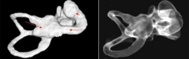 先天性內耳畸形的疾病種類繁多,診斷比較困難,隨著高分辨CT和磁共振(MRI)的應用,目前診斷率不斷提高。臨床常見的內耳畸形包括大前庭導水管綜合癥、先天性耳蝸畸形、米歇爾聽障及沙伊貝聽障。本篇將后三種畸形介紹如下:</p><p> 先天性耳蝸畸形(Congenital cochlear malformation)</p><p> 先天性耳蝸畸形又稱Mondini內耳發育不全,是最常見的一種內耳畸形。</p><p> 1、病因</p><p> 本病可為常染色體顯性或隱性遺傳病,也可為非遺傳性因素,如風疹病毒感染、過多的放射線暴露以及反應停類藥物等引起。</p><p> 2、臨床表現</p><p> 先天性耳蝸畸形包括耳蝸扁平、耳蝸發育不良,特別是第二圈和頂圈發育不良,兩者合并為一個腔;前庭擴大,巨大的前庭導水管以及半規管畸形、內耳道擴大等癥。在具體病例中不一定以上所有的畸形同時出現,可僅出現其中一種或幾種畸形。</p><p> 3、聽力學表現</p><p> 出生即無聽力,或1~2歲時才出現聽力減退,主要為感音神經性聽障,部分可為混合性聽障,有部分患者可長期保存殘余聽力。個別患者可有眩暈發作。</p><p> 4、診斷</p><p> 主要根據聽力學表現和影像學檢查。通過高分辨CT可看到耳蝸畸形。內耳MRI顯示膜迷路內水充盈,耳蝸扁平,耳蝸第二圈與頂圈間隔缺損,以及半規管、前庭的畸形。</p><p> </p><center><img alt="" src="/upfiles/201903250158493159.png" width="640" height="200" /></center><p></p><p> 先天性耳蝸畸形伴前庭和外半規管發育不良</p><p> 5、治療</p><p> 目前尚無有效的治療方法。如有殘余聽力,可佩帶助聽器后進行語言康復。無殘余聽力或極重度聽障患者可考慮人工耳蝸植入。</p><p> 米歇爾聽障(Michel’s deafness)</p><p> 屬常染色體顯性遺傳,是最嚴重的內耳畸形,內耳可完全未發育,可伴有其它器官的畸形和智力障礙。</p><p> 1、診斷</p><p> 主要依靠顳骨高分辨CT和內耳MRI。</p><p> </p><center><img alt="" src="/upfiles/201903250158577271.png" width="640" height="160" /></center><p></p><p> 雙側內耳畸形:左側無內耳迷路及內耳道機構,為米歇爾畸形;右側空耳蝸及前庭擴大,為先天性耳蝸畸形</p><p> 2、治療</p><p> 目前無特殊辦法,此類病例不適合行人工耳蝸植入術,但是聽覺腦干植入術的適應癥,其效果有待進一步證實。</p><p> 沙伊貝聽障(Scheibe dysplasia)</p><p> 為常染色體隱性遺傳,是最輕的內耳畸形,畸形僅限于蝸管和球囊,故又稱耳蝸球囊型畸形。</p><p> 1、診斷</p><p> 主要根據先天性聽損和MRI檢查</p><p> 2、治療</p><p> 此病可選擇性地行人工耳蝸植入術。</p><p> 更多詳情請登錄聽覺有道助聽器m.wjbxw.com</p>" />
