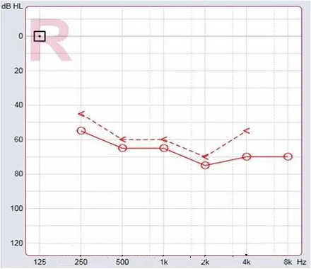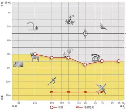 純音測試聽力圖的橫坐標為頻率,從左至右表示測試聲的頻率從低到高,即125Hz至8000Hz;縱坐標為強度,從上至下表示受試者能聽到的最小的聲音強度,以dBHL為單位。如下圖所示:</p><p> </p><center><img alt="" src="/upfiles/201903250213137760.png" width="440" height="400" /></center><p></p><p> 聽力圖的畫法自從1943年在C.C.Bunch的著作中出現后,至今沒有改變。通常右耳的測試結果用紅色表示,左耳用藍色。下圖是ASHA(1990)建議使用的各種標記符號,這些符號已在世界各地廣泛使用。</p><p> </p><center><img alt="" src="/upfiles/201903250213216822.png" width="440" height="250" /></center><p></p><p> 純音測試的測試項目有氣導、骨導、舒適閾與不舒適閾。那么這簡簡單單的聽力圖在驗配過程中有哪些重要作用呢?</p><p> 1、確定聽力損失程度</p><p> 按照世界衛生組織(WHO)1997年的標準,根據0.5kHz、1kHz、2kHz、和4kHz氣導平均聽閾值,將聽力損失分為輕度、中度、重度和極重度。</p><p> </p><center><img alt="" src="/upfiles/201903250213312187.png" width="440" height="180" /></center><p></p><p> 世界衛生組織(WHO-1997)的聽力障礙分級標準</p><p> 舉例</p><p> 下圖為某一聽力損失者所測得的聽力圖</p><p> </p><center><img alt="" src="/upfiles/201903250213367902.png" width="440" height="380" /></center><p></p><p> 0.5kHz的聽閾為65dBHL,1kHz的聽閾為65dBHL,2kHz的聽閾為75dBHL,4kHz的聽閾為70dBHL。則平均聽閾為(65+65+75+70)/4=68.75。將68.75dBHL代入以上分級表格,得到該聽力損失者的損失程度為重度。 聽力損失程度的確定有利于確定助聽器的功率。</p><p> 2、判斷聽力損失性質</p><p> 根據氣導、骨導的關系,可將聽力損失分為傳導性聽力損失、感音神經性聽力損失及混合性聽力損失。</p><p> 骨導與氣導之差大于10dB,且骨導在正常范圍內為傳導性聽力損失,表明聽力下降是由外耳、中耳病變引起。</p><p> 氣骨導一致(≤10dB)且都在正常范圍之外為感音神經性聽力損失。表明聽力下降是由耳蝸、聽神經損傷引起。</p><p> 骨導與氣導之差大于10dB,但骨導在正常范圍之外為混合性聽力損失,表明以上兩種聽力損失均有,由上述多種部位病變引起聽力下降。確定聽力損失性質還需結合臨床表現,也有助于助聽器佩戴效果的預測。</p><p> 3、解釋聽力損失者的日常生活困難</p><p> 聽力損失者在日常生活中經常遇到的問題有1)時而聽得到,時而聽不到;2)聽得到,聽不清;3)小聲聽不到,大聲受不了。</p><p> 時而聽得到時而聽不到</p><p> 以下圖平坦型聽力曲線為例,當周圍言語聲高于其聽閾,即處于曲線下方區域時,該聽力損失者能聽到;當周圍言語聲低于其聽閾,即處于曲線上方區域時,聽力損失者則聽不到對方的說話聲。此為“時而聽得到,時而聽不到”。</p><p> </p><center><img alt="" src="/upfiles/201903250213445950.png" width="440" height="340" /></center><p></p><p> 聽得到 聽不清</p><p> 中文漢語元音輔音的頻率及響度有其分布圖,如下圖所示。以陡降型聽力曲線為例,該聽力損失者聽不到大部分的輔音。聽得清不清楚,主要取決于高頻輔音聽得到聽不到。例如該聽力損失者“g”、“ch”聽不到,但“u”能聽到,因此,他會將“姑姑”、“出租”都聽成“uu”。聽不清楚時,再結合口型,前后句的冗余度猜測。猜對則談話繼續,猜錯則打岔。兒童聽力曲線若是如此,長期接收不正確的語音,會出現口齒不清。</p><p> </p><center><img alt="" src="/upfiles/201903250213526855.png" width="440" height="340" /></center><p></p><p> 小聲聽不到 大聲受不了</p><p> 小聲聽不到,大聲受不了是重振現象。以下圖聽力曲線為例,“飛機”處于不舒適閾附近,聽力損失者對“飛機”的聲音聽著受不了。另外,該聽力損失者聽不到“手表”等聲音。</p><p> </p><center><img alt="" src="/upfiles/201903250214013300.png" width="440" height="385" /></center><p></p><p> 為了更好地使聽力損失者家屬明白聽力損失者的困難,目前有較多的工具可以模擬聽力損失狀態下的溝通與交流。</p><p> </p><center><img alt="" src="/upfiles/201903250214075950.png" width="440" height="370" /></center><p></p><p> 比如,在聲音樣本中選擇“餐廳”,并選擇“正?!?,可聽到正常聽力者在“餐廳”環境中聽到的聲音;若選擇“患者”,則可使聽力正常者聽到聽力損失者聽到的聲音,令聽力正常者親身體驗他們所處的“模糊世界”。</p><p> 在“典型聽力圖”中,有“輕度”、“中度”、“重度”、“極重度”、“陡降型聽力”等選項,若選擇“重度”,則可體驗重度聽力損失者所聽到的聲音。</p><p> 4、調試</p><p> 聽力圖在助聽器驗配調試過程中也起著非常重要的作用。</p><p> 首次驗配</p><p> 助聽器處方公式結合聽力圖計算出聽力損失者的目標增益,為驗配師的進一步調節奠定了基礎。聽力圖結果越準確,首次驗配的滿意度越高。</p><p> 調試</p><p> 在助聽器調試過程中,不能忽視聽力圖的作用。舉一實例:下圖為某助聽器佩戴者的聽力圖,經過多次降低高頻增益,仍反應聲音刺耳。通過對聽力圖的觀察,該佩戴者2kHz處的聽閾較高,且2kHz處的增益亦較多。將2kHz處的增益降低后,助聽器佩戴者的滿意度提高。</p><p> 讀懂聽力圖是驗配助聽器過程中非常重要的一環,只有讀懂聽力圖并解釋清楚聽力圖,對成功驗配助聽器可達到事半功倍的效果。在助聽器驗配調試環節,亦不能忽視聽力圖。聽力圖在整個助聽器驗配過程中起到不可替代的作用。</p><p> 更多詳情請登錄聽覺有道助聽器m.wjbxw.com</p>" />