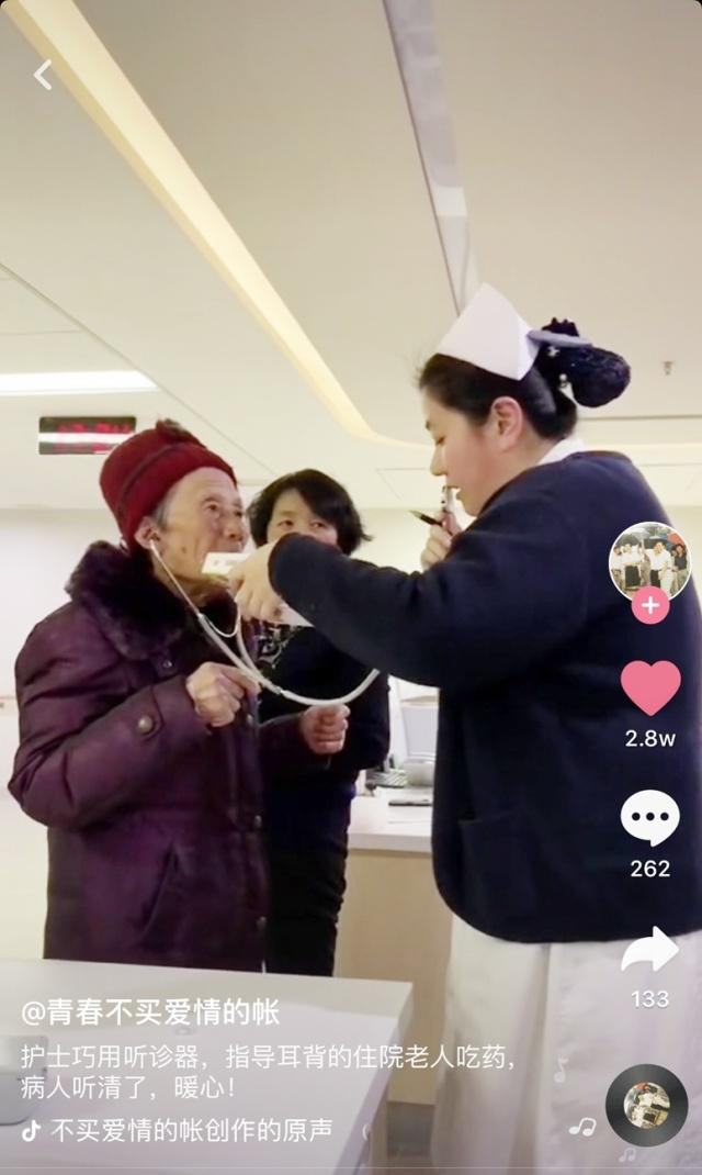 <span style="white-space:pre"> </span>“一天吃幾個(gè)呀?”<br /><br /> “一天三次,一次兩顆!”<br /><br /> “哦,一天三次,哦哦。”<br /><br /> 短短的三句話(huà),15秒。<br /><br /> 一條護(hù)士用聽(tīng)診器當(dāng)“臨時(shí)助聽(tīng)器”,為一位耳背老奶奶講解用藥方法的抖音視頻在網(wǎng)上熱傳。<br /><br /> 視頻中的老奶奶是住在醫(yī)院的79歲老人,有點(diǎn)耳背,用聽(tīng)診器說(shuō)話(huà)的是護(hù)士黃艷,拍攝者是另一位護(hù)士蔣夢(mèng)婷。當(dāng)時(shí),老奶奶不知怎么吃藥,小黃喊了半天,奶奶也沒(méi)聽(tīng)清,于是靈機(jī)一動(dòng),就把聽(tīng)診器用上了。一旁的小蔣順手就把視頻分享到微信朋友圈里。<br /><br /> 友好醫(yī)院工作人員把這段視頻做成一條抖音視頻,以網(wǎng)名“青春不買(mǎi)愛(ài)情的帳”發(fā)送。“青春不買(mǎi)愛(ài)情的帳”說(shuō),本來(lái)就想與同事和朋友分享一下醫(yī)院護(hù)士既機(jī)智又暖心的行為,沒(méi)想到僅一天的工夫,竟獲百萬(wàn)點(diǎn)擊量,數(shù)萬(wàn)個(gè)贊。<br /><br /> “看到節(jié)節(jié)飆升的點(diǎn)擊量,我非常激動(dòng)。”“青春不買(mǎi)愛(ài)情的帳”說(shuō),可以看出人們對(duì)醫(yī)護(hù)人員這個(gè)行業(yè)的關(guān)注。<br /><br /> “我們對(duì)老人一個(gè)小小的關(guān)愛(ài)行為,竟引起網(wǎng)友的強(qiáng)烈反響,可以看到我們社會(huì)充滿(mǎn)愛(ài)。”<br /><br /> 除了熱情點(diǎn)贊,還有不少網(wǎng)友發(fā)表了評(píng)論。<br /><br /> “給這個(gè)職業(yè)的工作者點(diǎn)贊,她們的真的很偉大,也很不容易。”<br /><br /> “最美護(hù)士!”<br /><br /> “太贊了,真是暖心一幕。”<br /><br /> “這個(gè)職業(yè)工作者不容易,為這個(gè)護(hù)士姐姐點(diǎn)贊。”<br /><br /> 還有的網(wǎng)友打趣,表示學(xué)到了一招:“太有才了,聽(tīng)診器開(kāi)發(fā)出新用途。”<br /><br /></span><p><span style="font-size:16px;"> “對(duì)這個(gè)可以。心臟不好的聽(tīng)心臟;肺不好了聽(tīng)肺;嗓子不好了,可以當(dāng)喇叭使;耳朵不好了可以當(dāng)助聽(tīng)器。”</span></p><p style="text-align: center;"><span style="font-size:16px;"><img src="/upfiles/201907240350126074.jpg" alt="" /><br /></span></p>" />