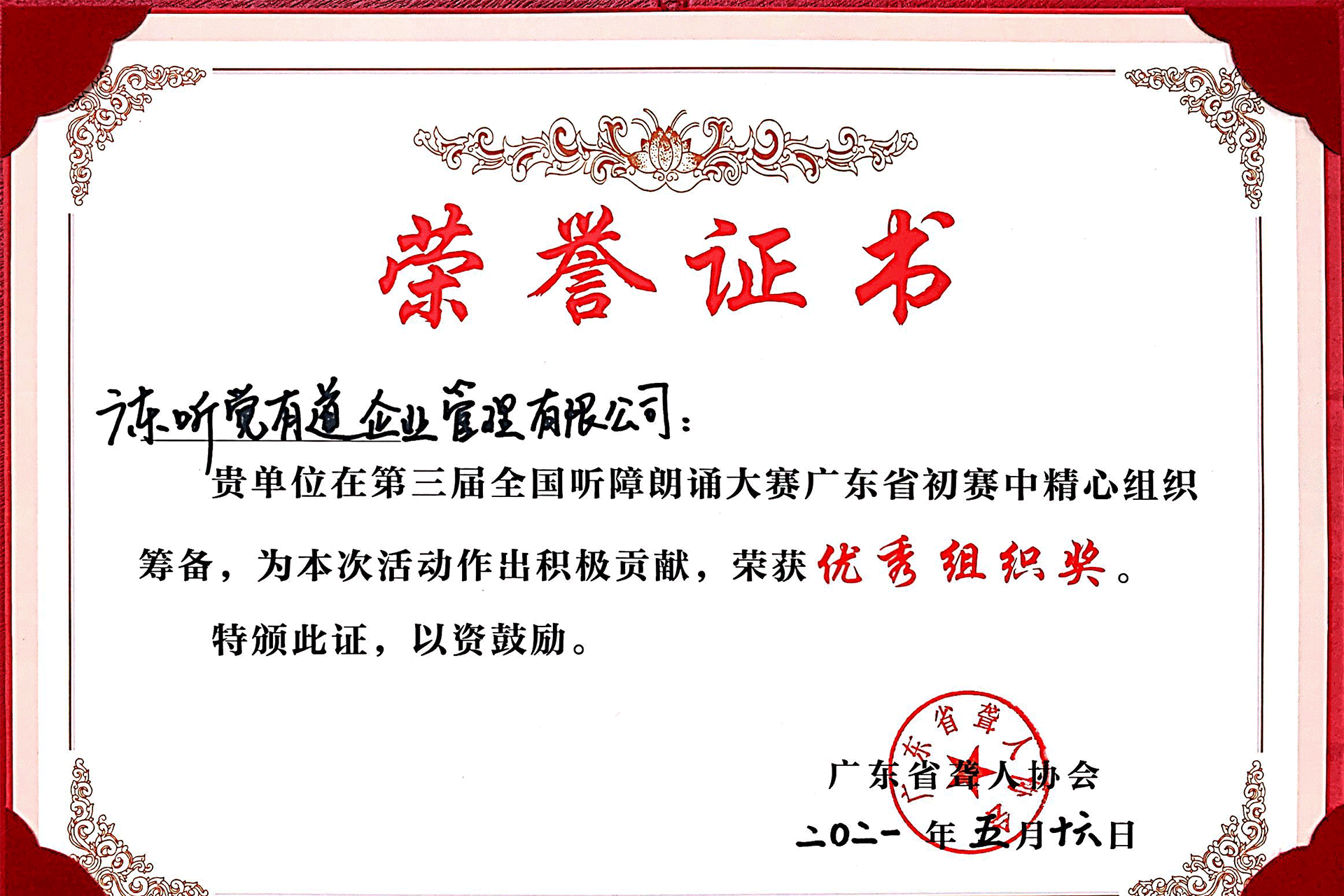 聽覺有道獲廣東省聾人協會頒發“優秀組織獎”。