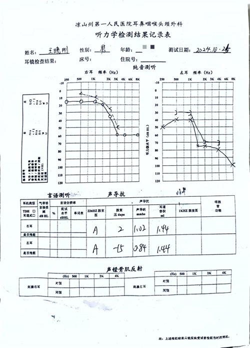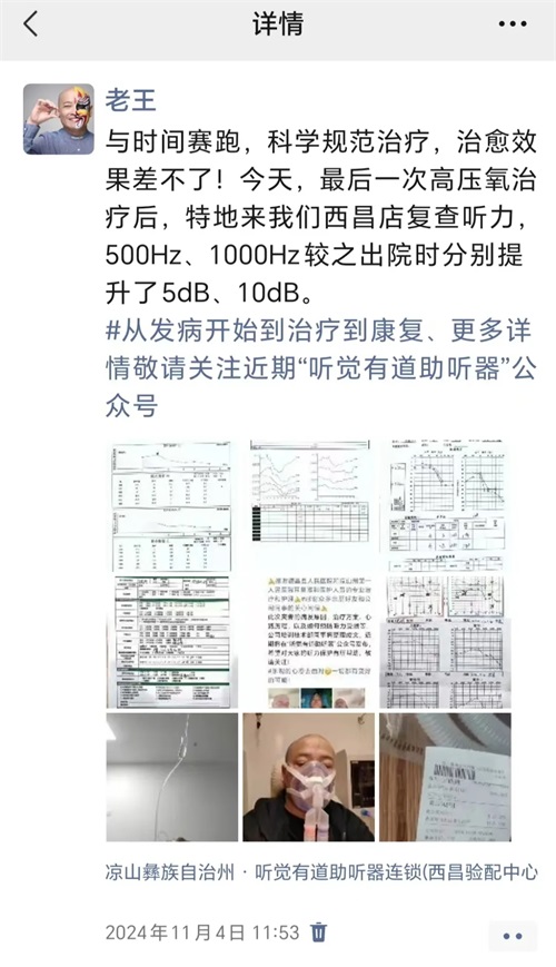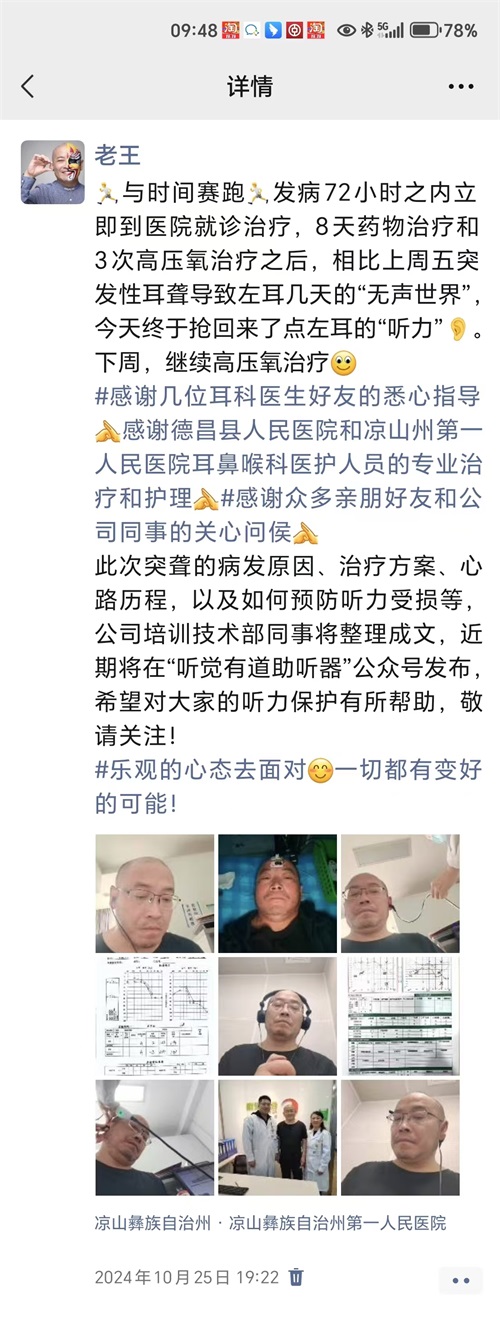在這個快節(jié)奏的世界里,每一個細微的聲音都承載著生活的溫度。然而,突如其來的聽力挑戰(zhàn),卻讓這份美好變得模糊。<br /><br /><br />聽覺有道全國聽力連鎖聯(lián)合創(chuàng)始人王曉剛先生,期間或因工作過度操勞,于2024年10月16日的夜晚,耳道內(nèi)突然響起了一聲“砰”的異響。次日,他的耳內(nèi)又相繼出現(xiàn)了“噗噗”聲、“滋滋”聲的雜音,與人交談時,聽不清、甚至聽不到對方的話語變得愈發(fā)顯著。<br /><br /></span><p><span style="font-size:16px;">以下任何一項癥狀單獨或突發(fā)性耳聾的發(fā)病原因及發(fā)病機制尚不明確,多認為與病毒感染、腫瘤性病變、自身免疫疾病、藥物中毒內(nèi)耳缺血等因素相關(guān)。<br />過度勞累,焦慮、精神壓力及相關(guān)心理因素等被認為是常見的誘發(fā)因素。伴隨出現(xiàn),均有可能是突發(fā)性聾:<br />1、突然發(fā)生的主觀聽力下降(但是根據(jù)聽力損失的程度以及頻率不同,不是所有的病人都有聽力下降的感覺)<br /><br /><br />2、耳鳴(約90%)<br /><br /><br />3、耳悶脹感(50%以上)<br /><br /><br />4、眩暈、惡心、嘔吐(30%~50%)<br /><br /><br />5、聽覺過敏或重振(表現(xiàn)為對聲音異常敏感或者異常遲鈍,導(dǎo)致刺耳感或者失真感)<br /><br /><br />6、耳周感覺異常:(如麻木感、針刺感等不適感覺(全聾患者常見))<br /></span></p><p><span style="font-size:16px;">18日下午,當(dāng)他嘗試堵住右耳,竟發(fā)現(xiàn)左耳幾乎無法捕捉到外界的任何聲響。此刻,王總深刻意識到,自己的聽力出現(xiàn)了嚴重問題,于是立即趕往當(dāng)?shù)蒯t(yī)院耳鼻喉科進行檢查,最終被確診為突發(fā)性耳聾。</span></p><p><br /></p><p style="text-align: center;"><img src="/upfiles/202411140426063076.jpg" alt="" /><br /></p><p><br /></p><p><span style="font-size:16px;">回想起發(fā)病初期,王總表示,當(dāng)自己突然失去聽力,完全與外界隔絕的那一刻,內(nèi)心充滿了無助與恐懼。幸運的是,由于他長期深耕聽力行業(yè),對聽力受損有著較為深入的了解、明白:突聾聽力救治時間為黃金72小時內(nèi)。因此能夠識別癥狀并及時就醫(yī),從而得到了有效的治療。<br /><br /><br />然而,如今仍有許多患者對聽力健康的信息了解不足,錯過了最佳的治療時機,最終形成不可逆的聽力損傷,給日常生活、工作中帶來嚴重交流障礙。</span><br /></p><p><br /></p><p style="text-align: center;"><img src="/upfiles/202411140428078193.jpg" alt="" /><br /></p><p style="text-align: center;"><img src="/upfiles/202411140429087669.jpg" alt="" /><br /></p><p style="text-align: center;"><img src="/upfiles/202411140429178890.png" alt="" /><br /></p><p style="text-align: center;"><br /></p><p style="text-align: center;"><span style="font-size:16px;color:#ff9900;"><strong>什么是突發(fā)性耳聾?</strong></span></p><p style="text-align: center;"></p><div style="text-align: left;"><span style="font-size:16px;">醫(yī)學(xué)全名:突發(fā)性不明原因性聽力損失。</span></div><span style="font-size:16px;"></span><div style="text-align: left;"><br /></div><div style="text-align: left;"><br /></div><div style="text-align: left;">簡稱:突聾</div><div style="text-align: left;"><br /></div><div style="text-align: left;"><br /></div><div style="text-align: left;">根據(jù)中國2015年版《突發(fā)性聾診斷和治療指南》,突發(fā)性耳聾目前定義為:是指72小時內(nèi)突然發(fā)生、原因不明的感音神經(jīng)性聽力損失,至少在相鄰的兩個頻率聽力下降≥20dBHL。</div><div style="text-align: left;"><br /></div><div style="text-align: left;"><br /></div><div style="text-align: left;">近年來“突發(fā)性耳聾”患者年輕化趨勢明顯,年輕人患病比例增加了三至四成。耳蝸中的聽覺毛細胞一旦受損,在一定時間內(nèi)得不到及時治療,將不能再生。</div><div style="text-align: left;"><br /></div><div style="text-align: left;"><br /></div><div style="text-align: center;"><strong><span style="color:#ff9900;">臨床表現(xiàn)</span></strong></div><p></p><p><span style="font-size:16px;">突聾一般單側(cè)發(fā)病,個別情況下可以雙側(cè)發(fā)病( 1/10雙側(cè));</span><br /></p><p><span style="font-size:16px;"><br /></span></p><p style="text-align: center;"><span style="font-size:16px;color:#ff9900;"><strong>原發(fā)狀態(tài)</strong></span></p><p><span style="font-size:16px;">以下任何一項癥狀單獨或伴隨出現(xiàn),均有可能是突發(fā)性聾:<br />1、突然發(fā)生的主觀聽力下降(但是根據(jù)聽力損失的程度以及頻率不同,不是所有的病人都有聽力下降的感覺)<br /><br /><br />2、耳鳴(約90%)<br /><br /><br />3、耳悶脹感(50%以上)<br /><br /><br />4、眩暈、惡心、嘔吐(30%~50%)<br /><br /><br />5、聽覺過敏或重振(表現(xiàn)為對聲音異常敏感或者異常遲鈍,導(dǎo)致刺耳感或者失真感)<br /><br /><br />6、耳周感覺異常:(如麻木感、針刺感等不適感覺(全聾患者常見))<br /></span></p><p><span style="font-size:16px;"><br /></span></p><p style="text-align: center;"><span style="font-size:16px;color:#ff9900;"><strong>繼發(fā)狀態(tài)</strong></span></p><p><span style="font-size:16px;">恐懼,焦慮;耳鳴帶來的心理、睡眠干擾等,嚴重影響生活質(zhì)量。<br /></span></p><p><span style="font-size:16px;"><br /></span></p><p style="text-align: center;"><span style="font-size:16px;color:#ff9900;"><strong>誘發(fā)因素</strong></span></p><p><span style="font-size:16px;">突發(fā)性耳聾的發(fā)病原因及發(fā)病機制尚不明確,多認為與病毒感染、腫瘤性
